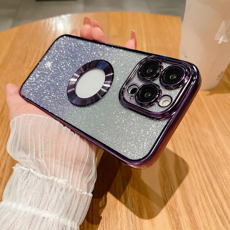 Лъскав калъф с брокат за iPhone 15 Pro и пълна защита на камерата. Силиконов кейс с брокатен лист, който може да се сваля и гърба става прозрачен. Красивата рамка с метален отблясък около кейса и обективите създават луксозно излъчване на вашия телефон.