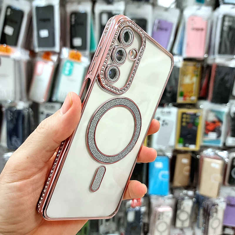 Луксозен блестящ калъф с кристали за Samsung Galaxy A54. Калъфа разполага с Magsafe за бързо зареждане и допълнителна защита на камерата. Прозрачния гръб ще подчертае цвета на телефона, а металния отблясък на рамката, заедно с кристалите ще направи телефона ви истинско бижу.