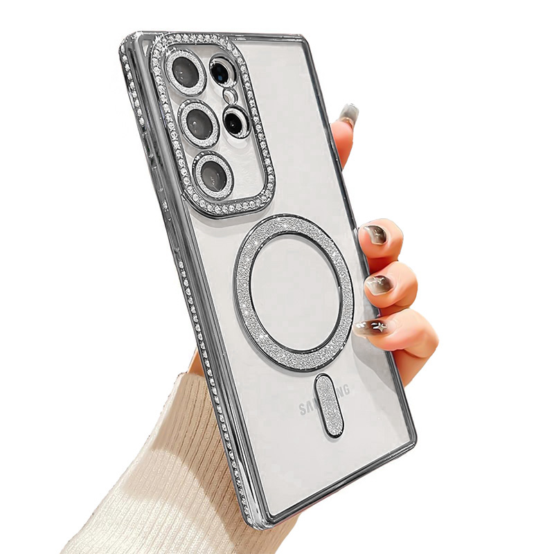 Луксозен блестящ калъф с кристали за Samsung Galaxy S25 Ultra. Калъфа разполага с Magsafe за бързо зареждане и допълнителна защита на камерата. Прозрачния гръб ще подчертае цвета на телефона, а металния отблясък на рамката, заедно с кристалите ще направи телефона ви истинско бижу.