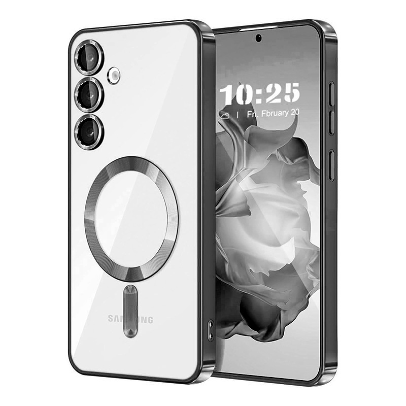 Луксозен калъф с Magsafe за Samsung Galaxy S25 Ultra с рамка с метален отблясък. Прозрачен и твърд калъф с бързо безжично зареждане на телефона. Отличава се с красивия външен вид, метални копчета и дизайн с рамка наподобяваща метал. Има пълна защита на камерата, а рамката около обективите внася допълнително лукс към този кейс.