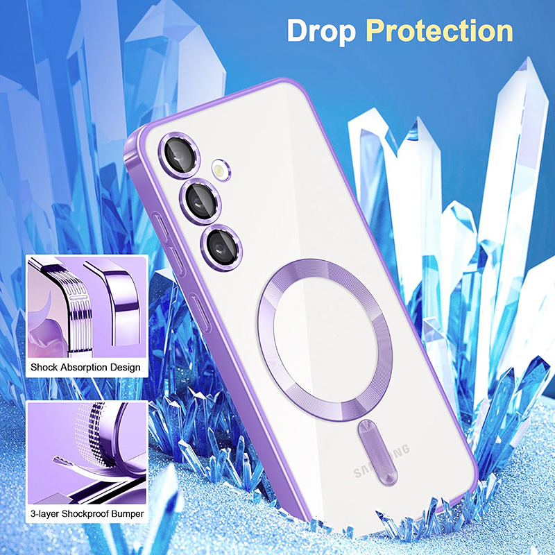 Луксозен калъф с Magsafe за Samsung Galaxy S25 Ultra с рамка с метален отблясък. Прозрачен и твърд калъф с бързо безжично зареждане на телефона. Отличава се с красивия външен вид, метални копчета и дизайн с рамка наподобяваща метал. Има пълна защита на камерата, а рамката около обективите внася допълнително лукс към този кейс.