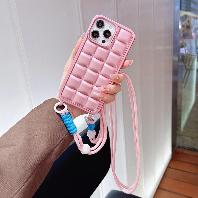 Луксозен калъф за iPhone 15 с въже за врата и 3D шарка на гърба. Красив женски калъф, който може да се носи на врата или рамото. Страхотен аксесоар за всяка жена.
