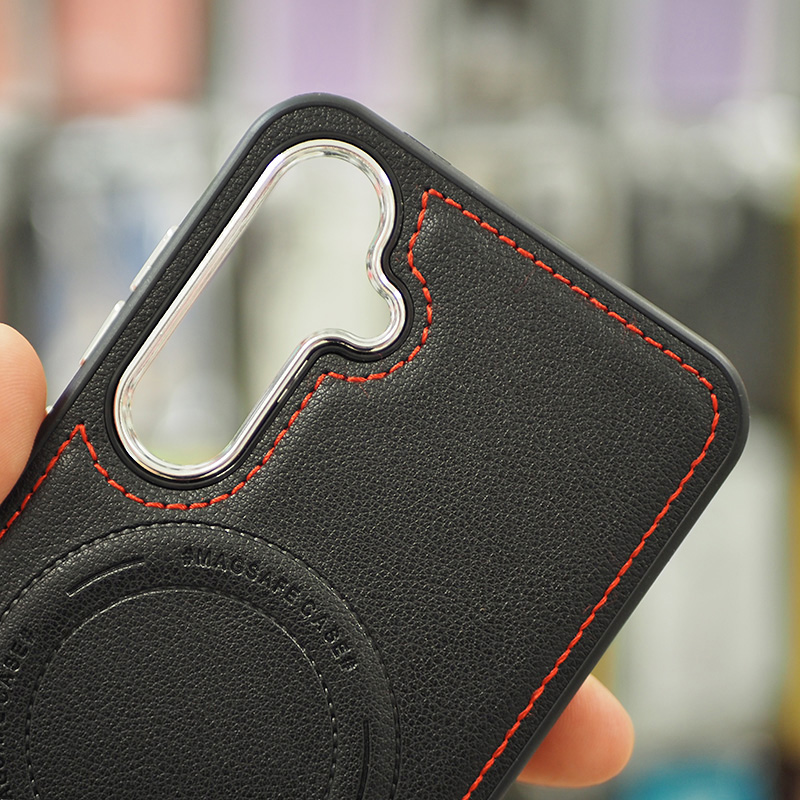 Луксозен кожен калъф с Magsafe за Samsung Galaxy S25 Ultra и шев на гърба. Красив калъф изработен от качествена ЕКО кожа, който ще предпази сигурно вашия телефон. Във вътрешната част на калъфа има място за две карти памет и игла.