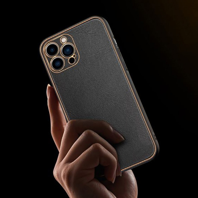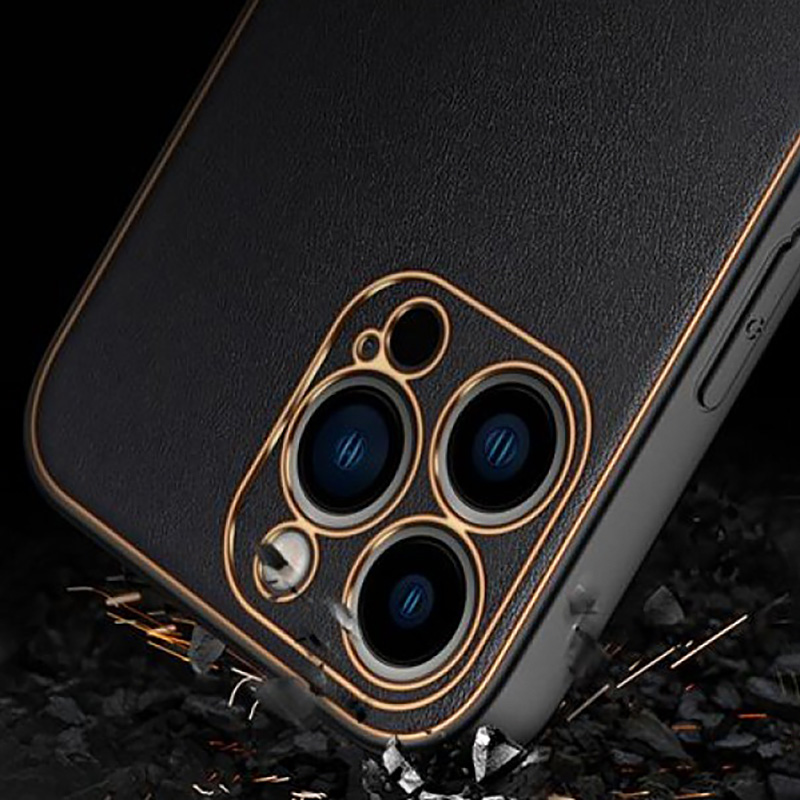 Луксозен кожен калъф за iPhone 14 изработен от качествена ЕКО кожа. Калъф с бизнес излъчване, красив дизайн и златен кант. Кейса разполага с повдигнат ръб около камерите, което осигурява допълнително защита при падане. Неговите заоблени ъгли и здравина го правят едновременно и удароустойчив. Предпазва вашия телефон от надраскване и счупване.