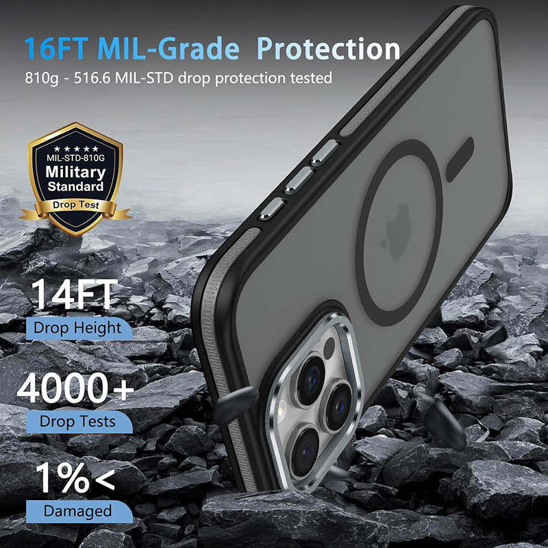 Калъфът е проектиран с ударопоглъщащи материали и 360° въздушни възглавници, които защитават всички ъгли на телефона. Тестван е за устойчивост при падане от височина до около 4.2 метра, което го поставя в категорията „military-grade“ защита. Повдигнатите ръбове около камерата и дисплея намаляват риска от надраскване и директен контакт с повърхности.