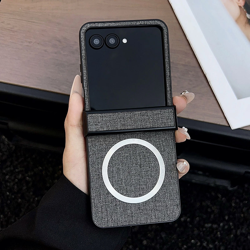 Магнитен калъф за Samsung Galaxy Z Flip 7 с текстилна текстура и пълна защита на пантите. Вграден магнитен пръстен за стабилно закрепване към магнитни стойки и зарядни. Точни изрязвания, повдигнати ръбове около камерата и сигурно прилягане без да пречи на сгъването.