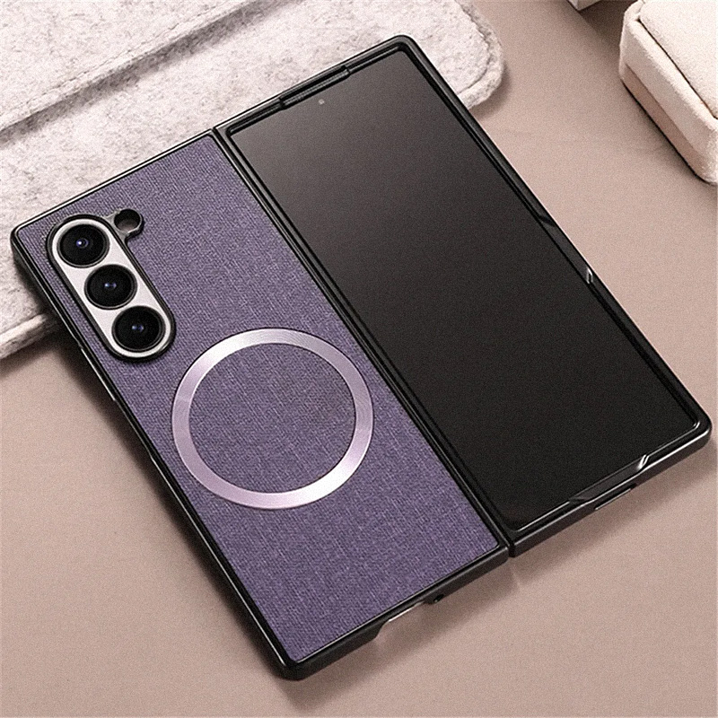 Магнитен калъф за Samsung Galaxy Z Fold 5 с текстилна текстура и отделна предна рамка за външния дисплей. Вграден магнитен пръстен за стабилно закрепване към магнитни стойки и зарядни. Точни изрязвания, повдигнати ръбове около камерата и сигурно прилягане без да пречи на сгъването.