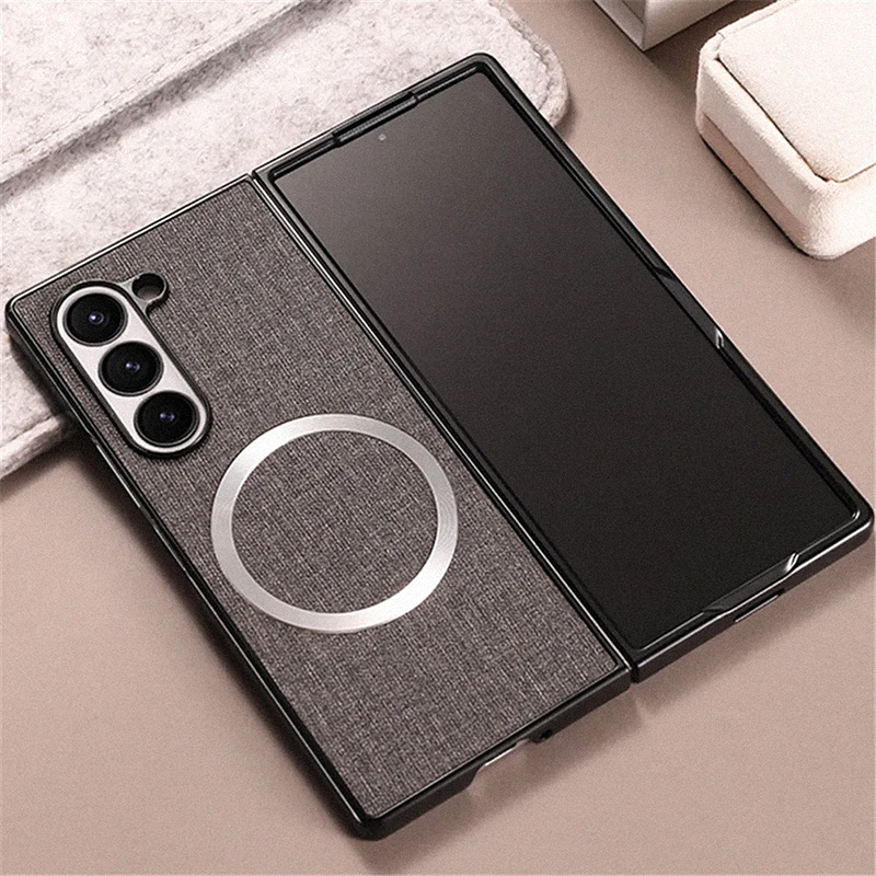Магнитен калъф за Samsung Galaxy Z Fold 6 с текстилна текстура и отделна предна рамка за външния дисплей. Вграден магнитен пръстен за стабилно закрепване към магнитни стойки и зарядни. Точни изрязвания, повдигнати ръбове около камерата и сигурно прилягане без да пречи на сгъването.