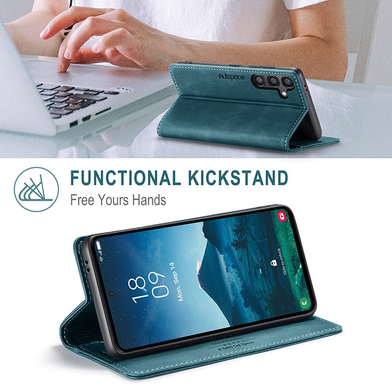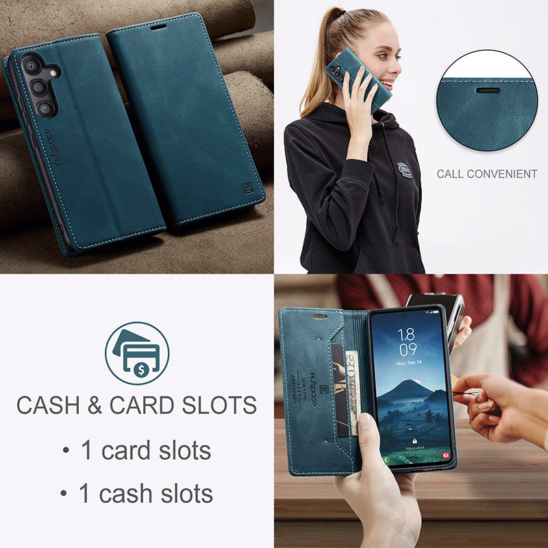 Кожен калъф за Samsung Galaxy A07 с вътрешни джобове. Истински оригинален и луксозен калъф от здрава ЕКО кожа. Красив дизайн с шевове по ръбовете, магнитно затваряне и с възможност да се използва и като стойка. Вземете този нов модел калъф и защитете сигурно вашият телефон.