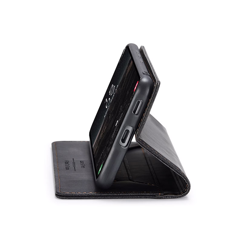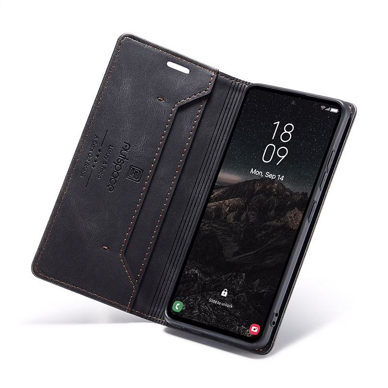 Кожен калъф за Samsung Galaxy A57 с вътрешни джобове. Истински оригинален и луксозен калъф от здрава ЕКО кожа. Красив дизайн с шевове по ръбовете, магнитно затваряне и с възможност да се използва и като стойка. Вземете този нов модел калъф и защитете сигурно вашият телефон.