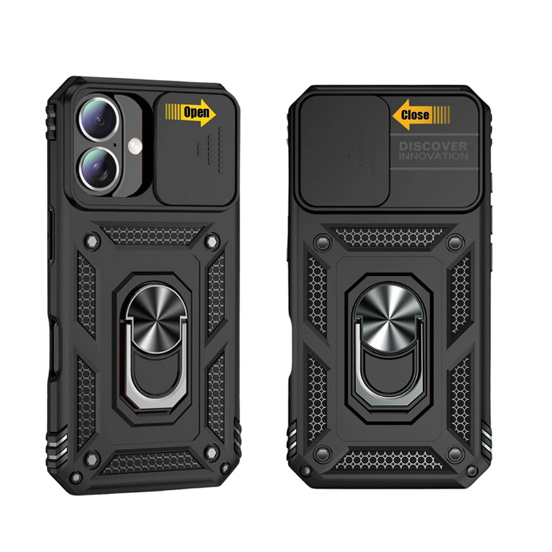 Удароустойчив калъф за iPhone 16e с пълна защита на камерата. Здрав калъф, който ще предпази телефона ви от удари и изпускания. Има специално капаче за камерата, което може да се отворя и затваря. Калъфа е изработен от здрав и плътен материал, който абсорбира ударите при падане. Екрана е допълнително защитен благодарение на високия ръб. На гърба пръстена може да се използва освен за държач и за поставка на маса.