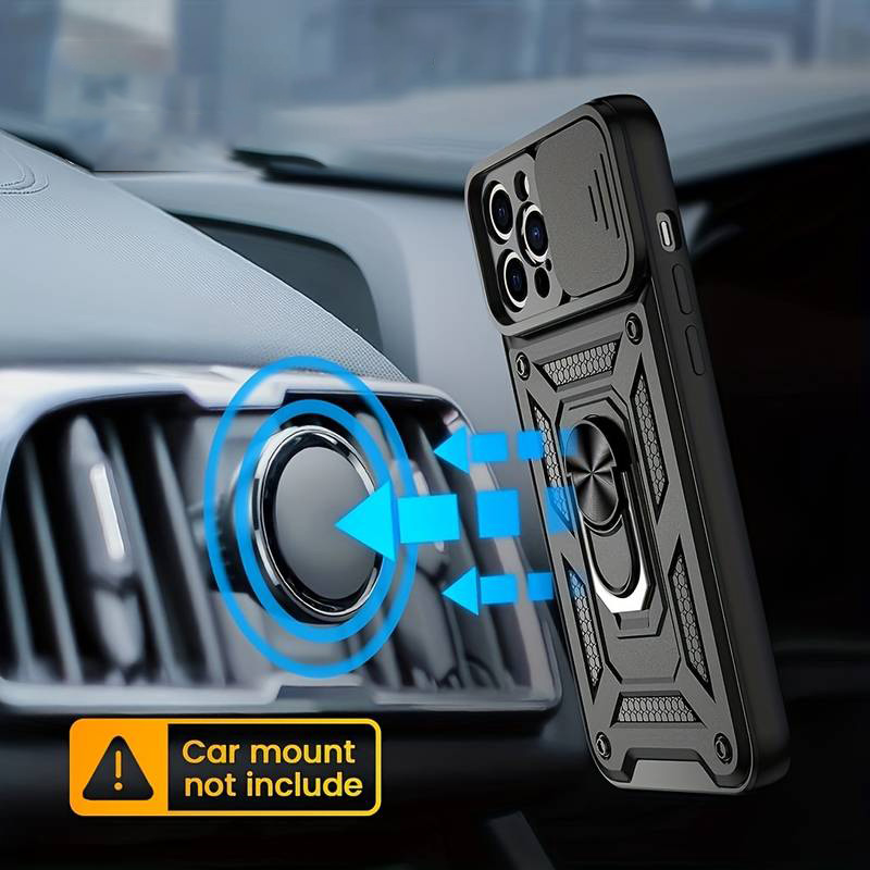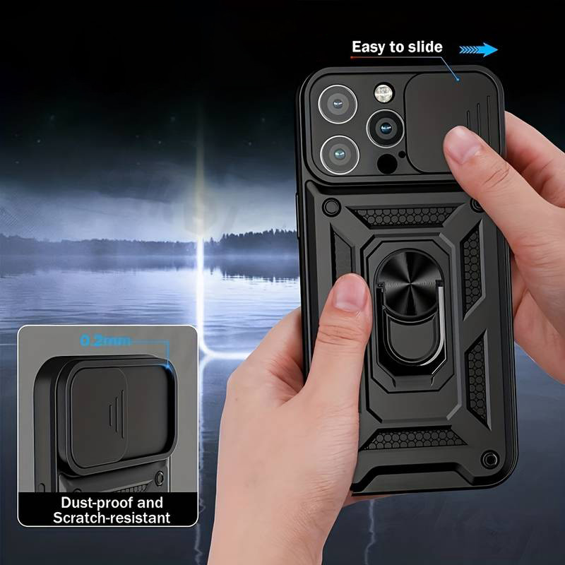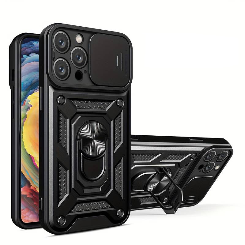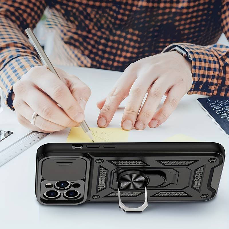 Удароустойчив калъф за iPhone 13 Pro тип Armor със защита на камерата. Здрав калъф, който ще предпази телефона ви от удари и изпускания. Има специално капаче за камерата, което може да се отворя и затваря.