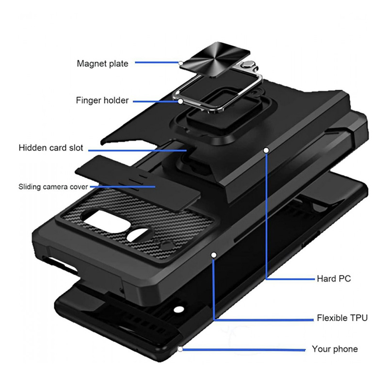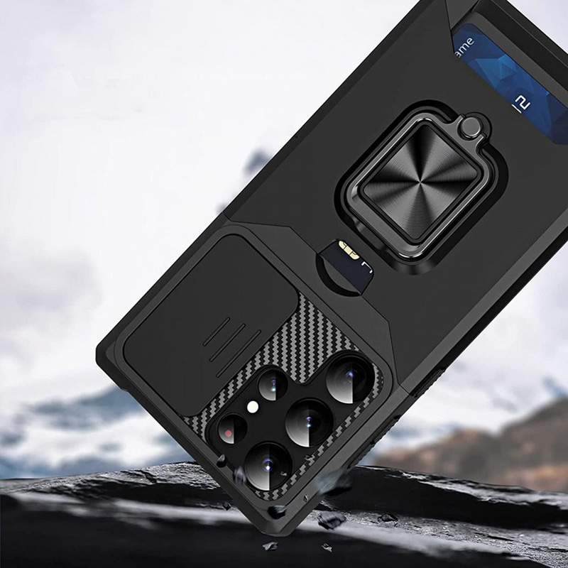 Вградената поставка с въртящ пръстен улеснява гледането на видео без да държите телефона. Специалният слот за карти ви позволява да носите документи или банкноти без портфейл, а магнитната функция е съвместима с автомобилни стойки. Плъзгащият капак предпазва камерата както от повреди, така и от нежелано заснемане, докато повдигнатите ръбове защитават екрана.