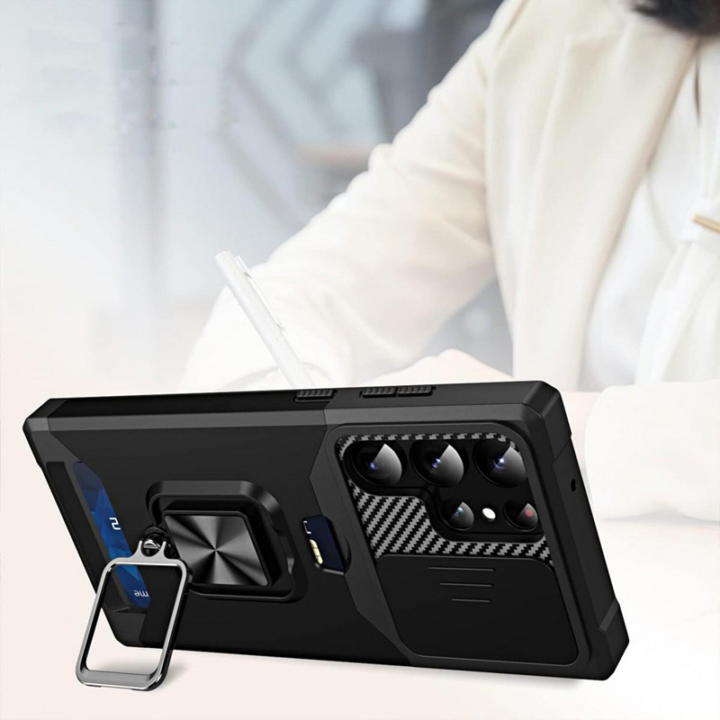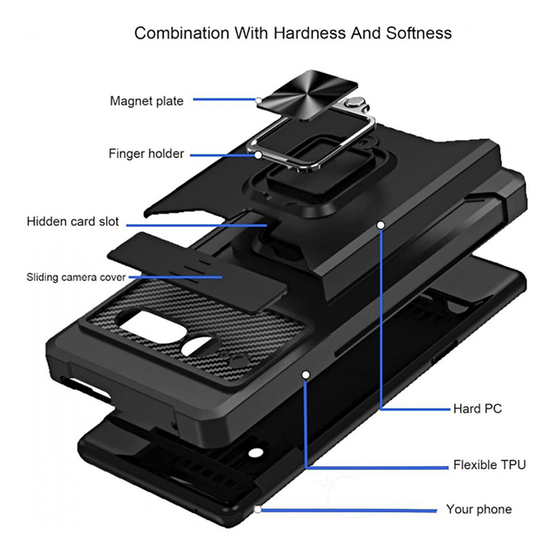 Калъфът комбинира въртящ се пръстен-стойка, магнитна функция, плъзгащ се капак за камерата и скрит слот за карти. (Забележка: за безжично зареждане трябва да се свали външният слой.)