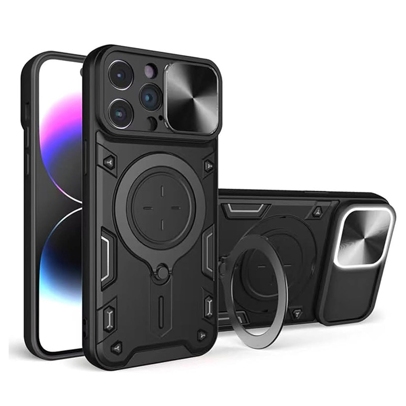Удароустойчив калъф с пръстен за iPhone 16, който ще предпази сигурно телефона ви. Изработен от здрав и твърд материал с голяма дебела, калъфа абсорбира ударите и предпазва телефона и екрана от повреди. На гърба на калъфа има пръстен, който може да използвате като поставка или при разговори с телефона. Повърхността е абразивна и осигурява добро захващате с ръката, което предотвратява изпускане. За защита на камерата се грижи подвижното капаче, което покрива изцяло камерите.