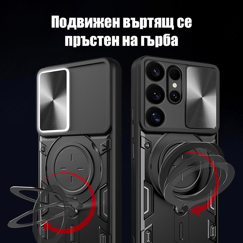 Удароустойчив калъф с пръстен за Samsung Galaxy S25 Ultra, който ще предпази сигурно телефона ви. Изработен от здрав и твърд материал с голяма дебела, калъфа абсорбира ударите и предпазва телефона и екрана от повреди. На гърба на калъфа има пръстен, който може да използвате като поставка или при разговори с телефона. Повърхността е абразивна и осигурява добро захващате с ръката, което предотвратява изпускане. За защита на камерата се грижи подвижното капаче, което покрива изцяло камерите.