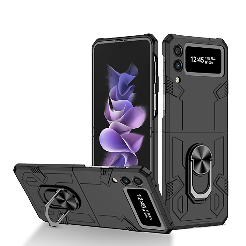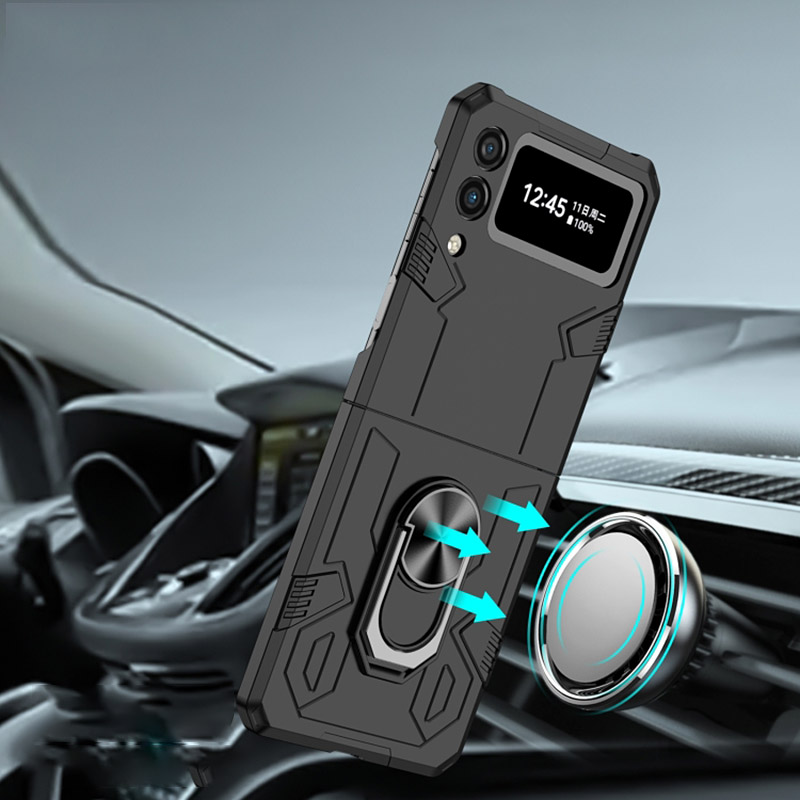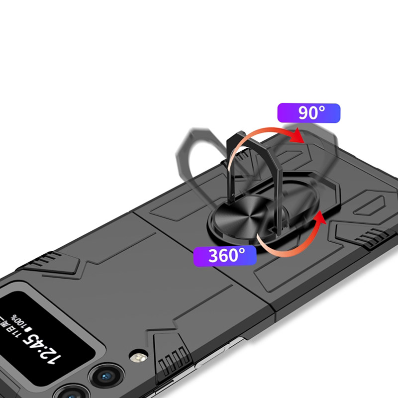 Удароустойчив калъф с ринг за Samsung Galaxy Z Flip 4 и защита на камерата. Калъфа идва с куп предимства като въртящ се пръстен, магнитна стойка,  стойка за маса и красив дизайн. Благодарение на твърдия и здрав материал този кейс ще предпази телефона ви от удари и падания. Идеален и за хора, които работят в тежката индустрия като строители или такива, занимаващи се с активен спорт. Не на последно място този калъф е подходящ и за деца, които често изпускат своите телефони.