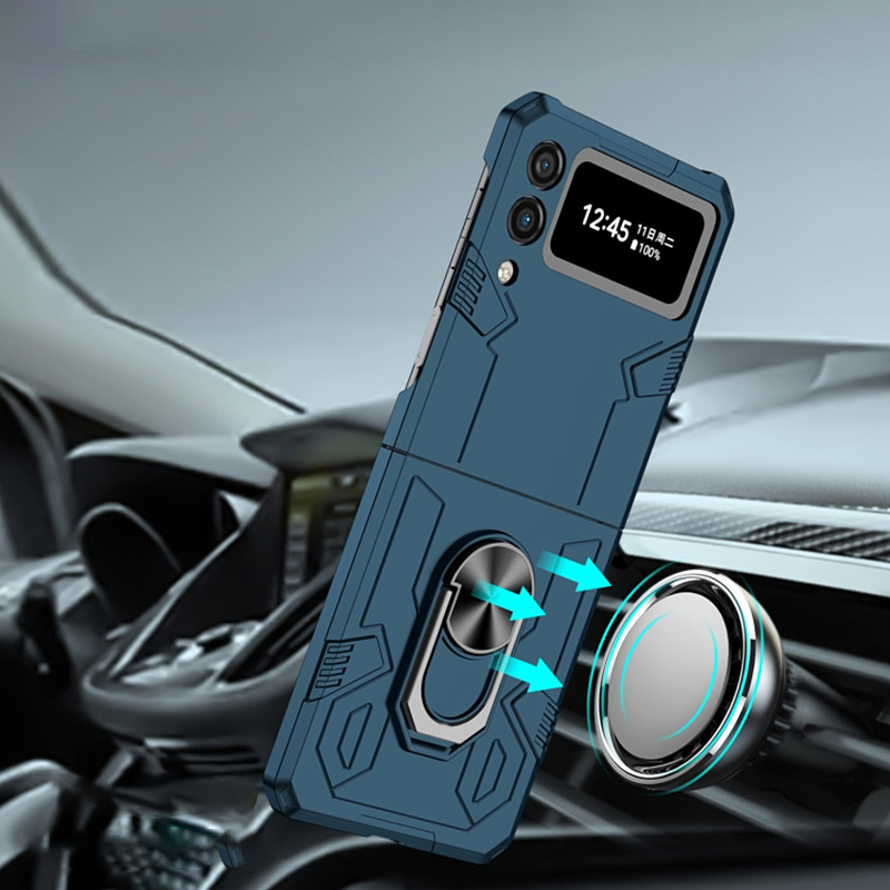 Удароустойчив калъф с ринг за Samsung Galaxy Z Flip 4 и защита на камерата. Калъфа идва с куп предимства като въртящ се пръстен, магнитна стойка,  стойка за маса и красив дизайн. Благодарение на твърдия и здрав материал този кейс ще предпази телефона ви от удари и падания. Идеален и за хора, които работят в тежката индустрия като строители или такива, занимаващи се с активен спорт. Не на последно място този калъф е подходящ и за деца, които често изпускат своите телефони.